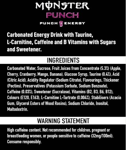 Ingredients List: Carbonated Water, Sucrose, Fruit Juices from Concentrate (5.3%) (Apple, Cherry, Mango, Cranberry, Banana), Glucose Syrup, Taurine (0.4%), Acid (Citric Acid), Acidity Regulator (Sodium Citrates), Flavourings, Thickener (Pectins), Preservatives (Potassium Sorbate, Sodium Benzoate), Caffeine (0.03%), Sweetener (Sucralose), Vitamins (B3, B6, B2, B12), Colours (E120, E163), L-Carnitine L-Tartrate (0.004%), Stabilisers (Acacia Gum, Glycerol Esters of Wood Rosins), Sodium Chloride, Inositol, Maltodextrin